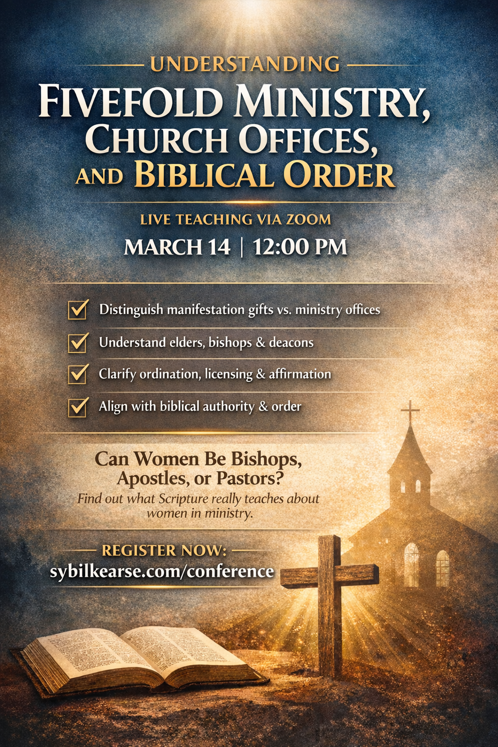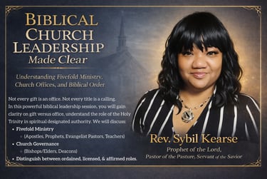 Join Rev. Sybil Kearse for an in-depth, scripture-based teaching that untangles common misunderstandings surrounding the fivefold ministry, elders, bishops, deacons, and recognition language such as ordination, licensing, affirmation, and confirmation.